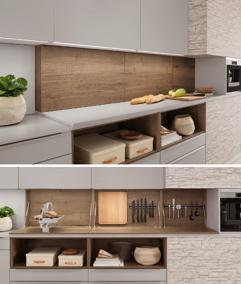 Door hoge keukenkasten toe te voegen of boven het werkblad losse hangkasten te plaatsen, creëer je extra opbergruimte. Daar past de inbouwapparatuur in, waardoor de losse apparaten op het aanrechtblad verdwijnen. Ook voor vele andere keukenspullen is er ruimte in de hoge kasten.