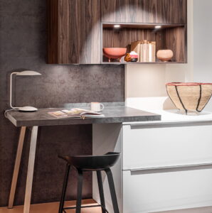 Een keukencoach heeft verrassende keuken ideeën hoe je een bureau op een fantastische manier in de keukenindeling verwerkt én helemaal aansluit bij de rest van het keuken. Thuiswerken of studeren in de keuken is zo héél plezierig!