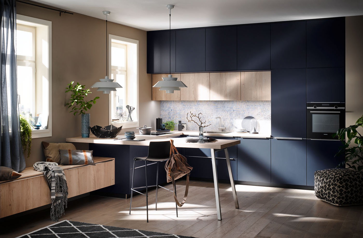 Door een bar te plaatsen combineer je gezelligheid met werkruimte in de kleine keuken. Misschien heb je dan geen losse tafel nodig? Je kunt natuurlijk zelf bepalen wanneer je de ruimte op de bar wil gebruiken voor het kokkerellen.