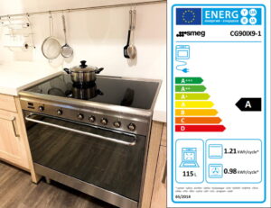 Op bovenstaande foto zie je het stoere zwarte inductie fornuis Prime Line van Bertazzoni met een multifunctionele oven in een groene landelijke keuken. De oven heeft een duurzame energieklasse A en een inhoud van 117 liter.
