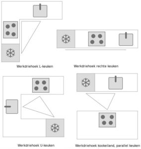 In de keuken heb je de 5 keukenzones: voorraad, opbergen, spoelen & afval, voorbereiden en koken & bakken. Bij de inrichting streef ik ernaar de koelkast, spoelbak en de kookplaat dicht bij elkaar te plaatsen om binnen deze werkdriehoek, het lopen te beperken.