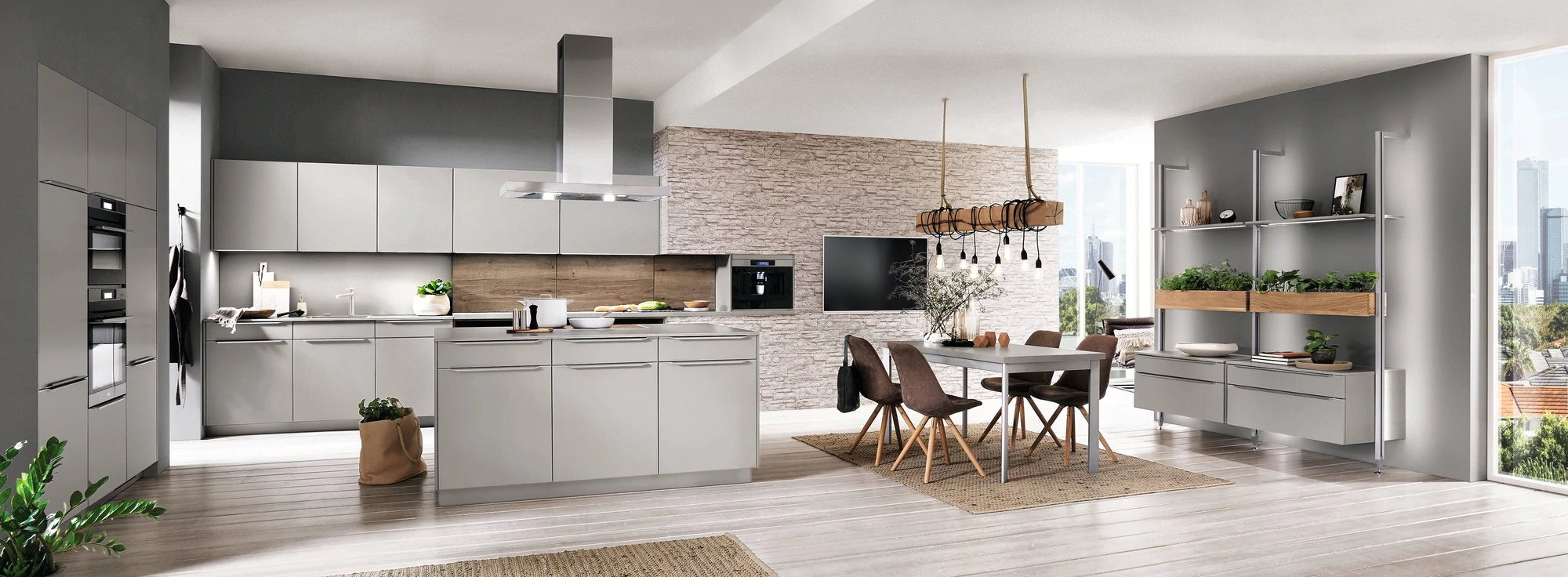 - Een strak design lichtgrijze keuken met kookeiland en kastenwand