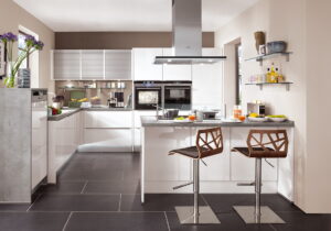 Hoogglans witte keuken met kookeiland + verstelbare keuken barkrukken Beliani Petersburg, Nobilia keuken Lux 814