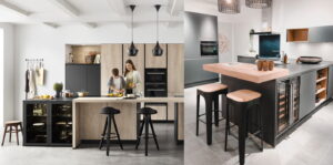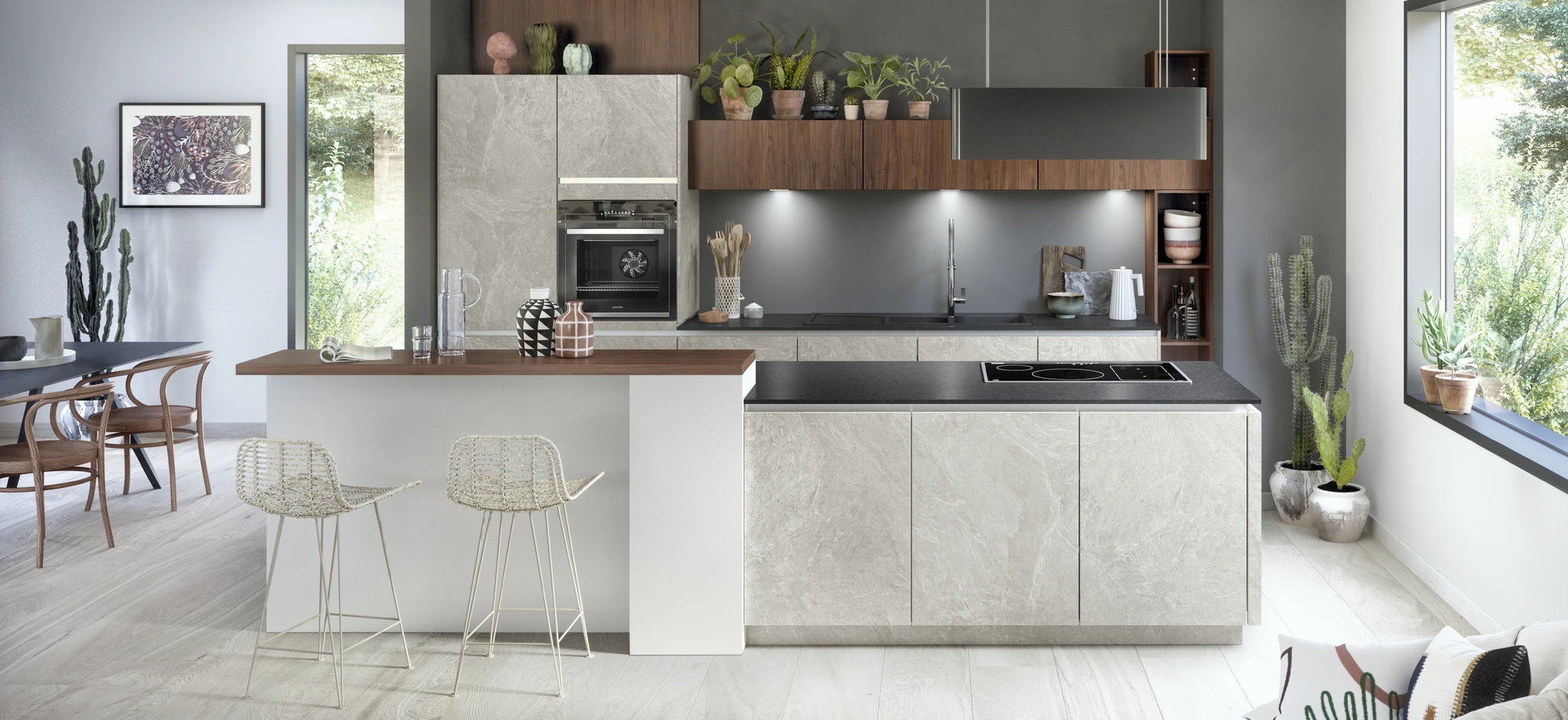 Decor eiken kookeiland + grafiet zwarte keukenkasten met bar en keuken barkrukken Livingstone Design Tuvalu, Nobilia keuken Linen Natura 744 Easytouch 961