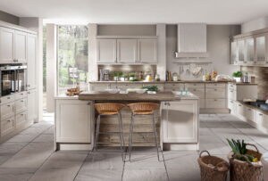 Landelijke keuken met spoeleiland, bar en keuken barstoelen van riet, Nobilia keuken Chalet 881