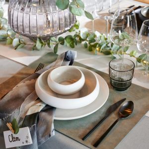 De gedekte kersttafel, helemaal in de moderne keukenstijl met landelijke accenten