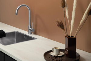 De rauwe industriële stadskeuken krijgt een exclusieve look door het stijlvolle natuursteen aanrechtblad in warme donkere grijs of bruin tinten. De kleur én het design van de zwarte Sturdy Black Selsiuz Hexagon kokend waterkraan (3-in1 kraan, 4-in-1 kraan en 5-in-1 kraan) springen eruit op bovenstaande foto van het Dekker Raw Luxury moodboard. De duurzame materialen steen, beton, hout en (verweerd) metaal zie je terug in de keuken van 2025: van aanrechtbladen, keukendeurtjes en achterwanden tot in de kleinste details: ambachtelijke accessoires.