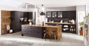Zwarte keukens zijn razend populair in alle keukenstijlen. Deze stoere moderne keuken met kookeiland wordt door het gebruik van hout (of hout-look), open vakken, landelijke kader- en glasdeuren de intieme ontmoetingsplaats tussen de kok(s) en de gasten.