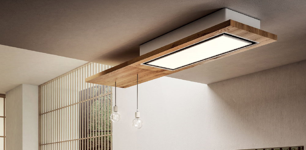 Sfeervolle plafond afzuigkap met houtomkleding en gezellige lampjes