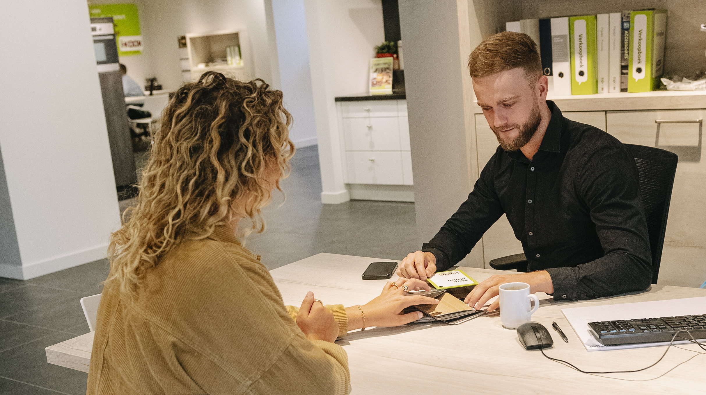 Welkom in de keukenshowroom en kijk rustig rond. Maak een praatje met een keukencoach als je vragen hebt. Maak je geen zorgen: een keukencoach dringt je niets op. Samen bekijk en ontdek je welke keukendeurtjes en keukenbladen jij het mooist vindt. Fijn als je al weet welke keukenstijl je geweldig vindt en voorbeeldfoto’s kunt laten zien. Als de eerste indruk goed is, gaan jullie beginnen aan de indeling van je nieuwe keuken in de professionele keukenplanner.