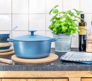 Van sjiek donkerblauw servies tot denim blauwe pannen met een flinke vintage feeling; blauwe keukenaccessoires laten de kleuren van je eten bijzonder fraai uitkomen.