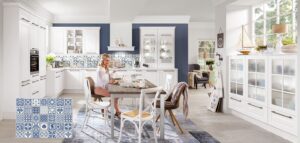 Op bovenstaande foto zie je een schitterende witte landelijke keuken met een keuken achterwand in Portugees tegelmotief Floral blauw, de inzet foto heeft decor Indigo Blue. Het grote voordeel van een laminaat achterwand is dat het materiaal hard is en goed is schoon te houden. Bij een echte tegelwand in de keuken worden de voegen snel vies. Het is ook een heel ‘gebik’ om de tegels te verwijderen als je jouw keuken een snelle keuken renovatie wil geven.