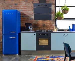Een vrijstaande blauwe retro koelkast knalt er uit in een moderne keuken en zeker ook in een industriële keuken zoals je boven kunt zien.