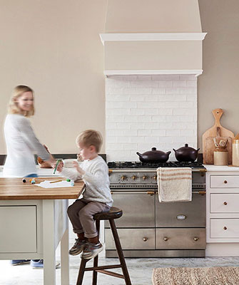 Mushroom (op de muren), Pompeian Ash (op de smetlijst) en Flint (op de keukenkasten) zijn kleuren van het verfmerk Little Greene die gebruikt zijn in de bovenstaande sfeervolle landelijke keuken. Ze komen uit de Intelligent Paints collectie van het Engelse verfmerk. De Little Greene verf is duurzaam, milieuvriendelijk en perfect voor muren, kasten en houtwerk in de ruimtes waar druk verkeer is zoals de keuken. De Intelligent verf is zowel in mat en hoogglans verkrijgbaar bij de verfspeciaalzaak.