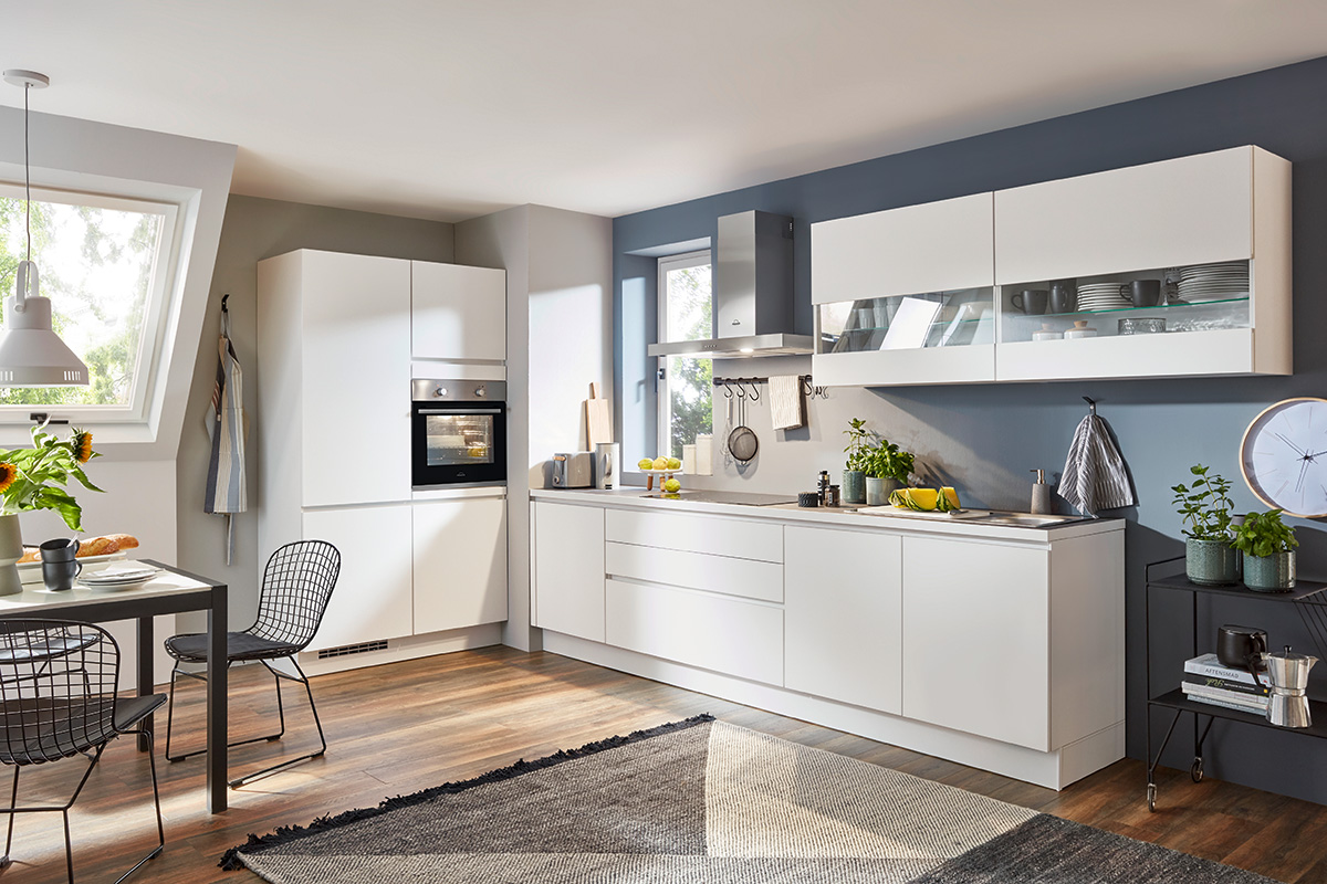 De greeploze witte keuken staat voor een strak, maar sfeervol design. Zeker wanneer je voor een gekleurde achterwand kiest. Door de lichte kleuren geniet je optimaal van de lichtinval. Er ontstaat een open ruimte met veel sfeer.