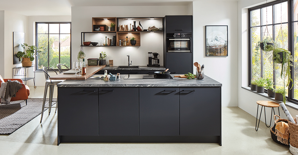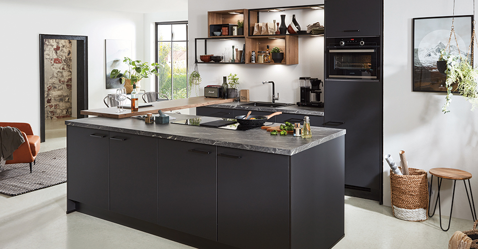 Deze moderne zwarte keuken heeft een luxe blad en moderne apparatuur. De twee keukenblokken worden met elkaar verbonden door een houten blad, dat daarmee direct dient als bargedeelte. Met de warme accessoires maak je van deze keuken een echte leefkeuken!