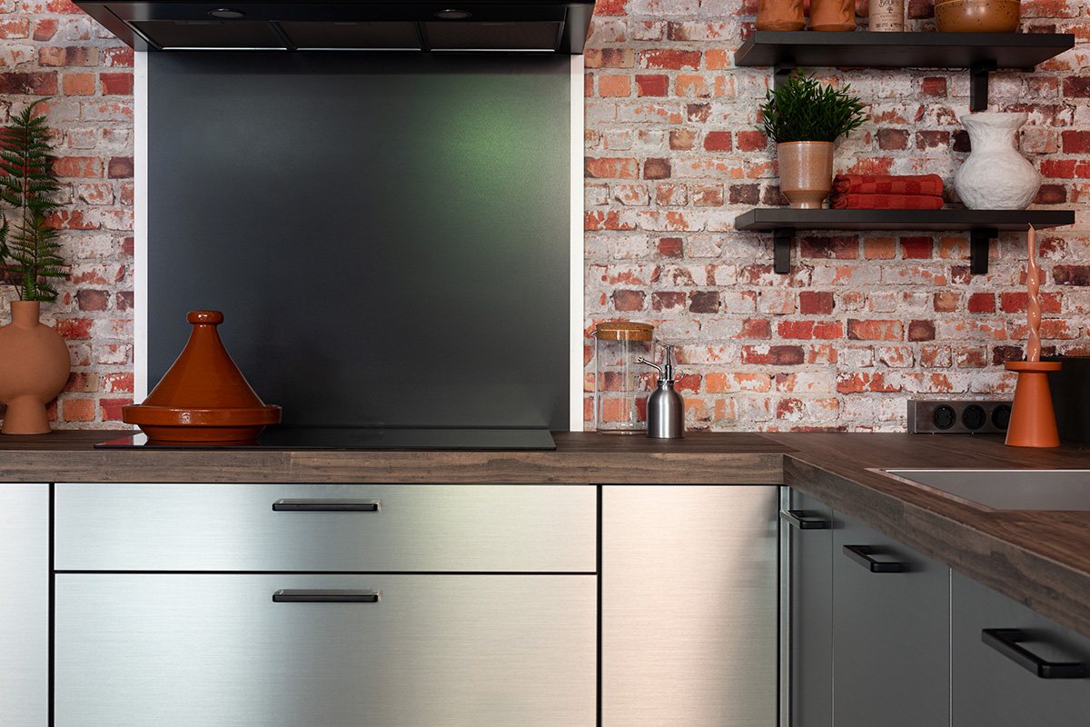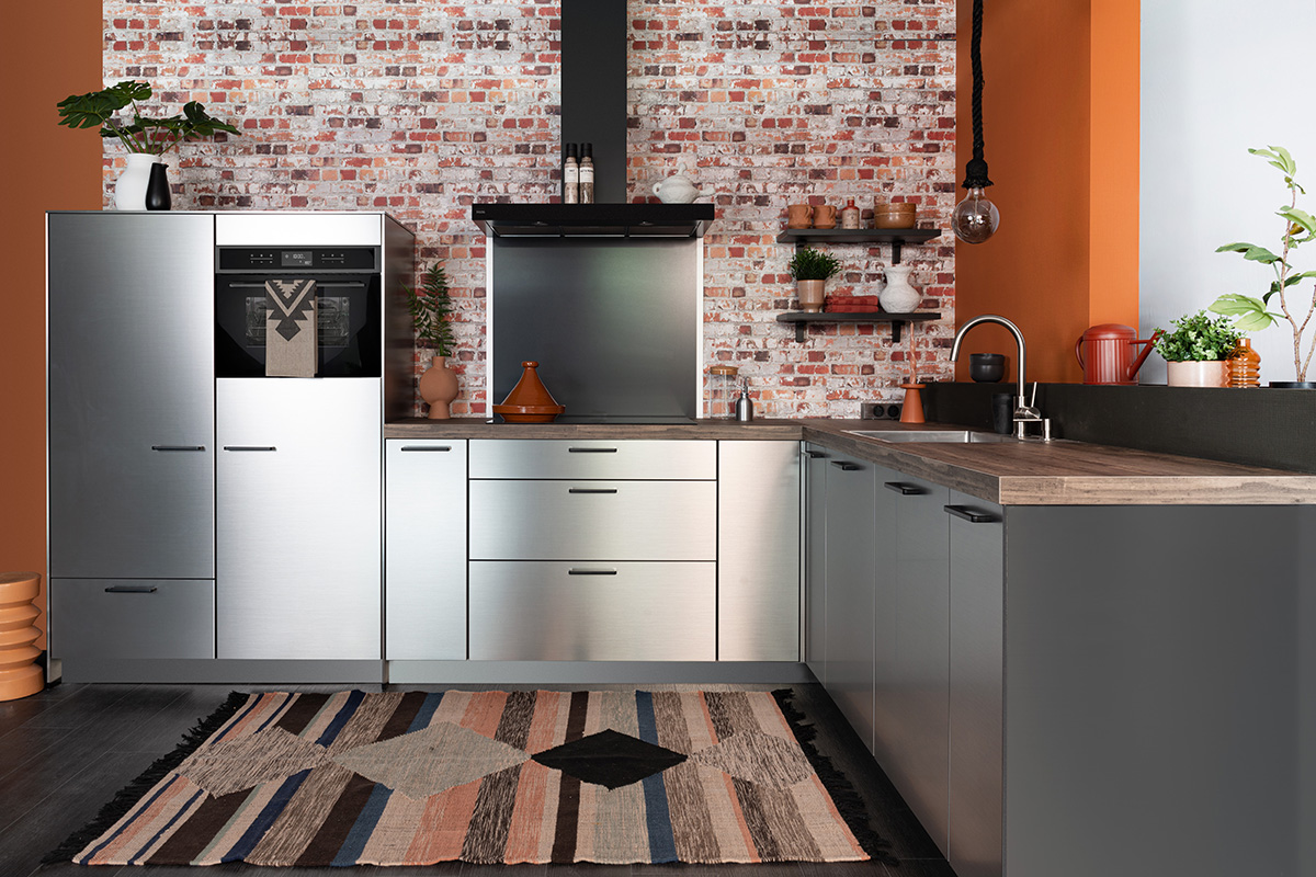 Deze industriële keuken is mooi gecombineerd met een vrolijke oranje tint, dat weer terugkomt in de accessoires. Een leuk detail; voor de achterwand is geen gebruikgemaakt van echte tegels, maar een tegellook behang. Een stoere look and feel in deze keuken!