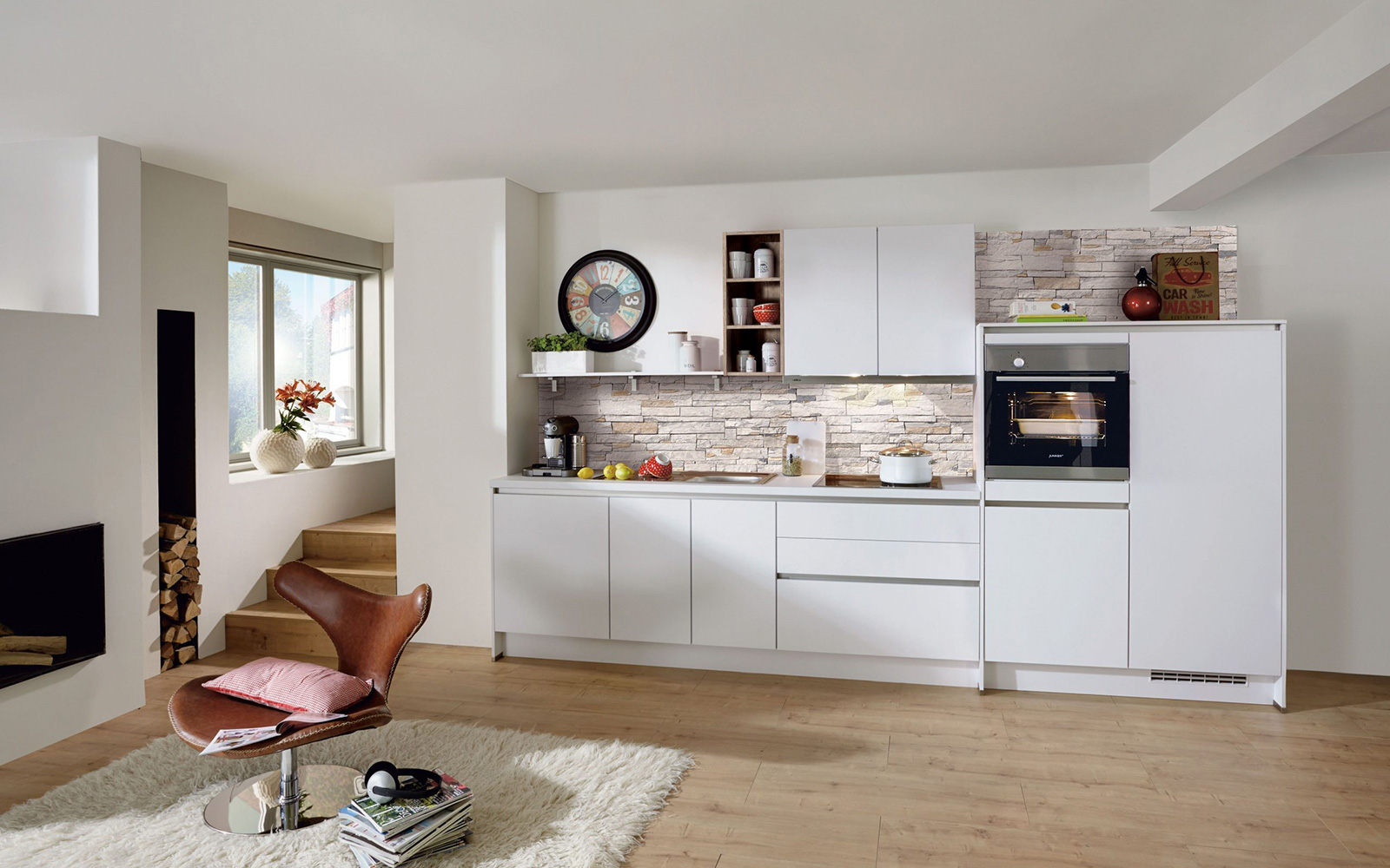 De greeploze keuken Lazio heeft mat uitgevoerde kunststof fronten. Hier als een prachtig ontworpen rechte keuken met strakke horizontale lijnen die zo kenmerkend zijn voor greeploos design. De achterwanden met houtdessin zorgen er voor dat de keuken, ondanks het moderne uiterlijk, toch warmte uitstraalt.
