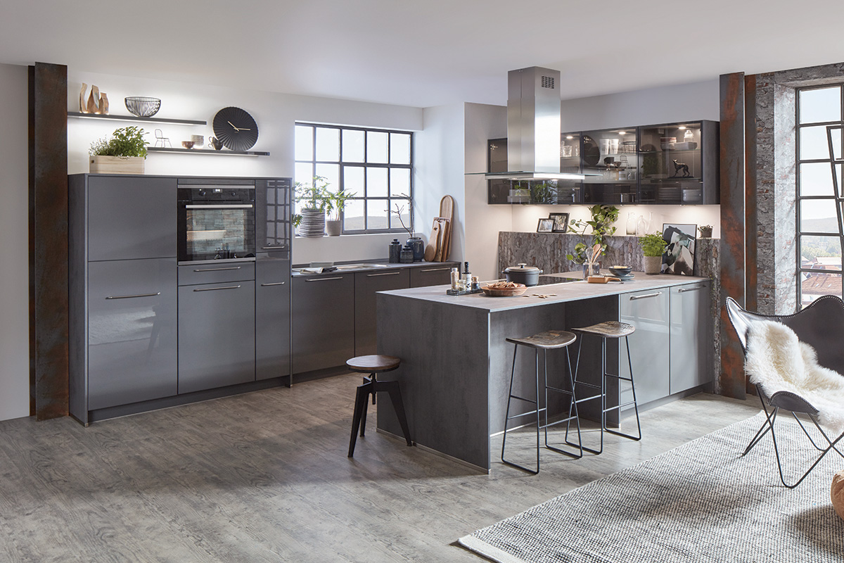 Een ruime keuken met schiereiland is perfect wanneer je daar de ruimte voor hebt en het gezellig vindt om ’s avonds een drankje te doen. De hoogglans grijze keukenkasten hebben horizontale stanggrepen welke mooi in het ontwerp passen. Er zijn diverse hoogglans kleuren beschikbaar; wit, alpin wit, grijs, zijdegrijs en magnolia.