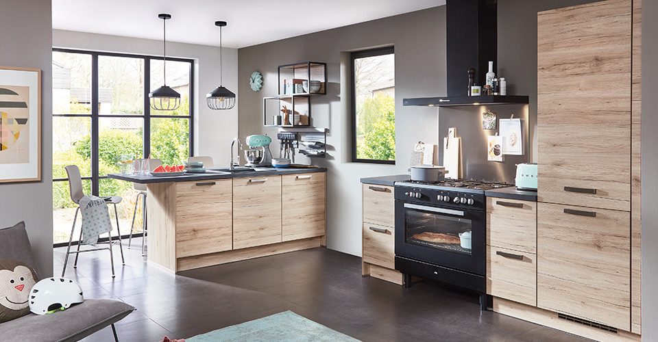 Een moderne keuken met houten fronten voor een warme uitstraling. Het spoeleiland met zitgedeelte heeft niet veel ruimte nodig, maar zorgt toch voor een gezellig middelpunt in de keuken. Wij hebben diverse fornuizen beschikbaar met een inductiekookplaat.