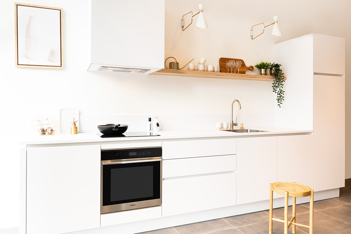Onze ontwerpers laten zien dat een rechte keuken zeker niet saai hoeft te zijn. De greeploze mat witte keuken is voorzien van grote kasten en lades, modern apparatuur en houten accenten. Met natuurlijke accessoires maak je deze keuken helemaal af. Betaalbare luxe voor iedereen!