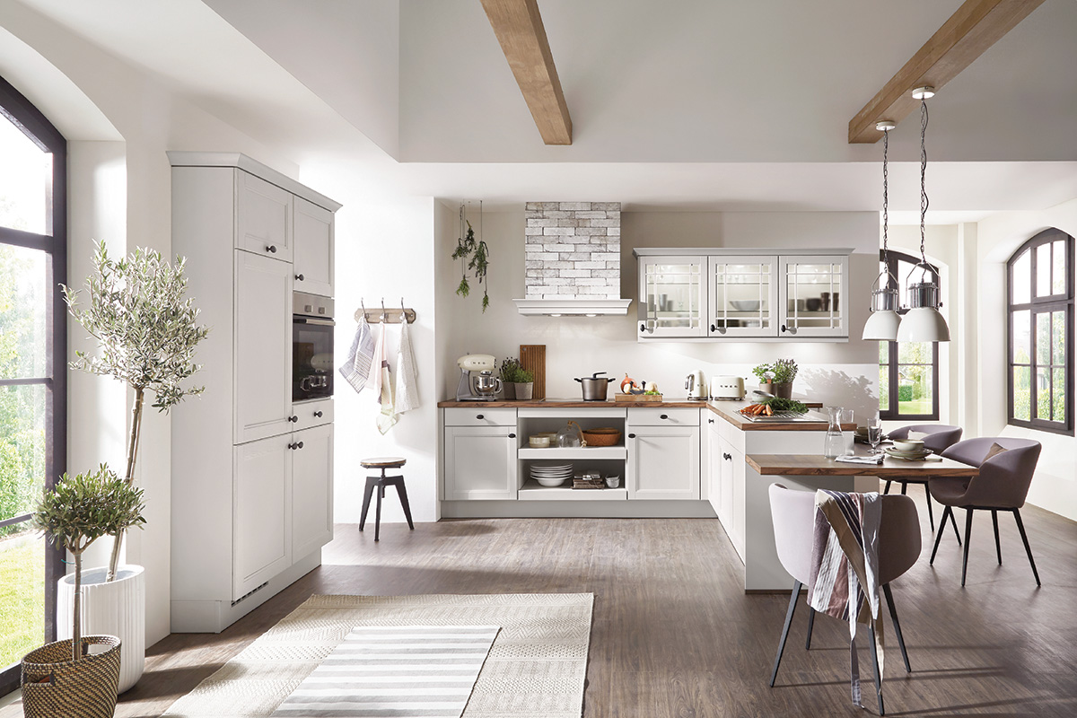 Wanneer je een grote ruimte tot je beschikking hebt, kun je gaan voor deze prachtige grote keuken. Het ontwerp heeft een landelijke stijl en is een echte leefkeuken. De fronten met kader zijn zijdegrijs gelakt en hebben een kleine greep. In deze keuken is aan ieder detail gedacht.