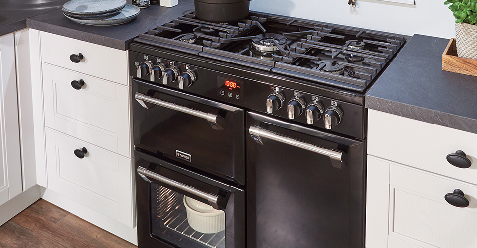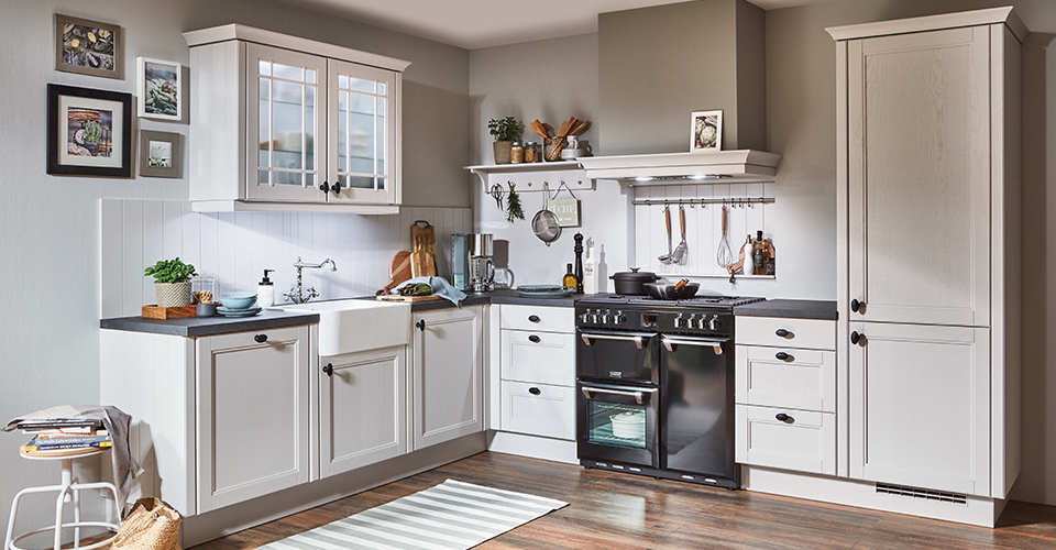 Deze landelijke keuken is uitgevoerd met sfeervolle kaderdeuren en is beschikbaar in zijdegrijs gelakt. De wandaccessoires en de glaskasten geven de keuken een extra gezellige look. Onze ontwerpers hebben ervoor gekozen de keuken af te maken met een stoer zwart fornuis met drie ovens.