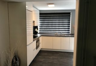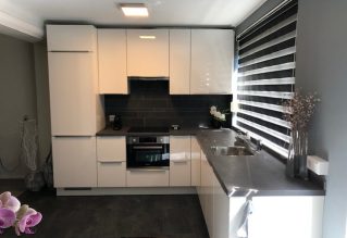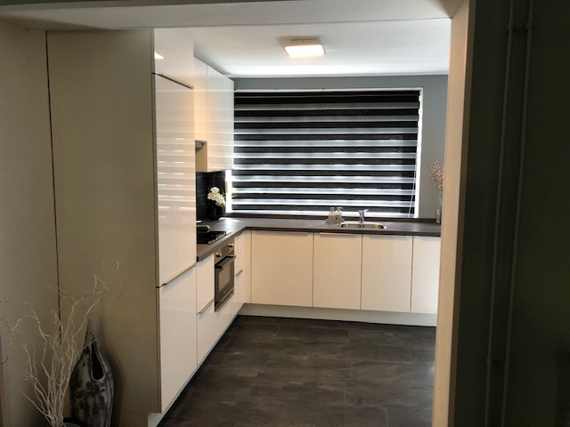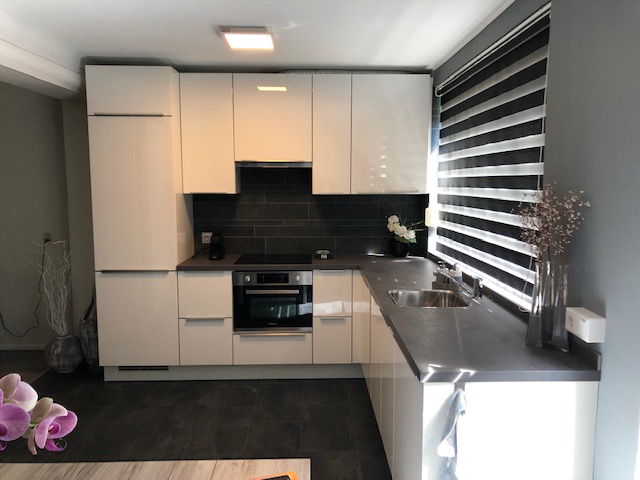 We hebben gekozen voor hoogglans witte kasten in combinatie met brede rvs handgrepen en een grijs werkblad, prachtig.
