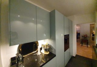 We hadden een specifieke front uitgekozen namelijk Oceaanblauw metallic hoogglans en we wilden de keukenkasten greep loos met veel lades voor en opbergruimte, maar niet vol mat kasten.