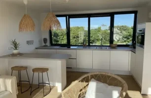 Wat ziet de keuken er prachtig uit! Deze moderne keuken combineert strakke lijnen met natuurlijke elementen voor een frisse en uitnodigende sfeer. Vanuit de keuken heb je prachtig uitzicht op de groene omgeving. Jullie zullen je nooit vervelen tijdens het keuken! Heel veel plezier hiermee!