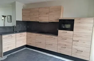 Wat een prachtige keuken! En mooi om te horen hoe jullie het hele proces hebben ervaren. Wij zijn in ieder geval blij dat jullie nu eindelijk kunnen genieten van deze keuken. Deze ruime hoekkeuken combineert een moderne uitstraling met natuurlijke elementen. De houtkleurige kastdeuren geven een warme en uitnodigende sfeer. Echt een plaatje! Veel kookplezier de komende jaren!