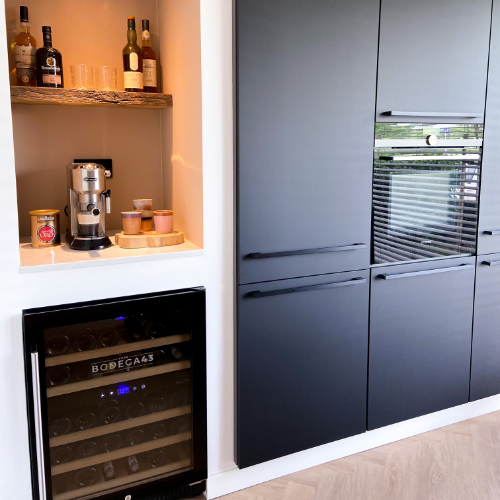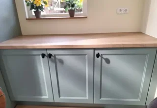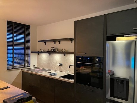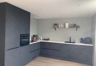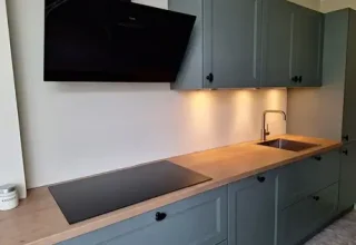 Hartelijk dank voor je fantastische recensie en het delen van deze prachtige foto's van je nieuwe keuken! Wat ziet het er geweldig uit! De combinatie van de mat blauw-grijze kasten en het warme houten werkblad zorgt echt voor een stijlvolle en moderne uitstraling in je ruimte. Het subtiele design van de keuken, met de strakke lijnen en minimalistische details, maakt het een tijdloos en praktisch geheel. We wensen jullie ontzettend veel plezier met deze prachtige keuken!