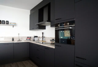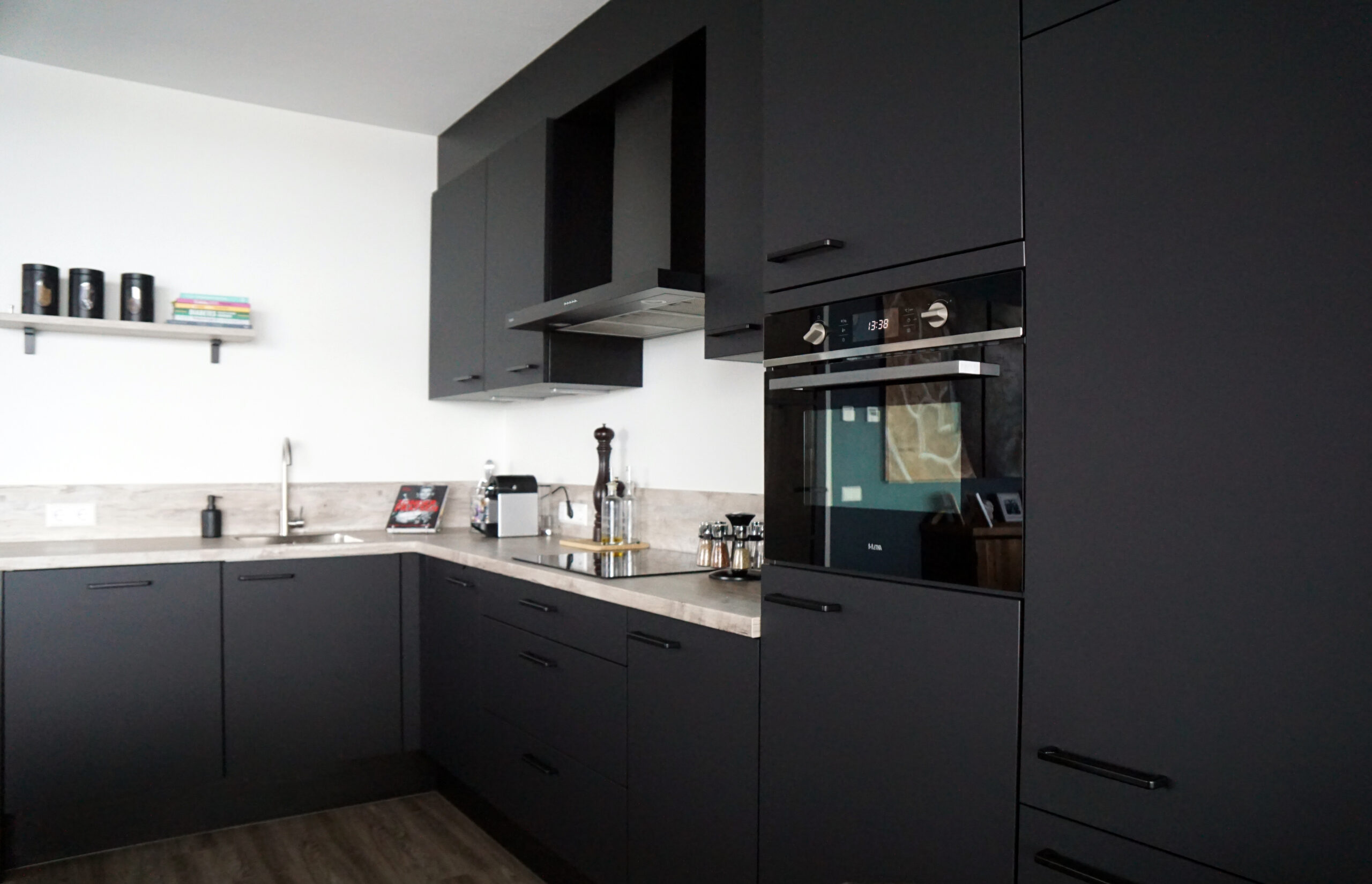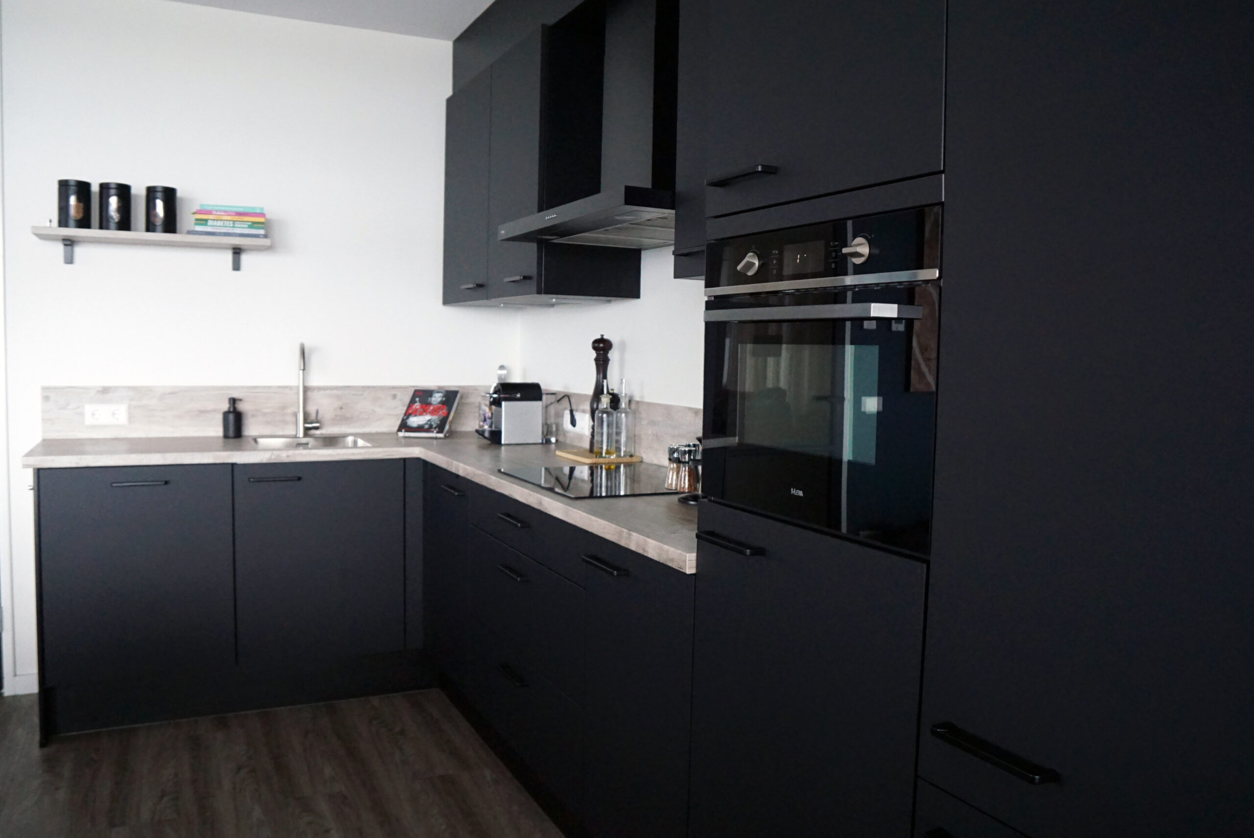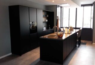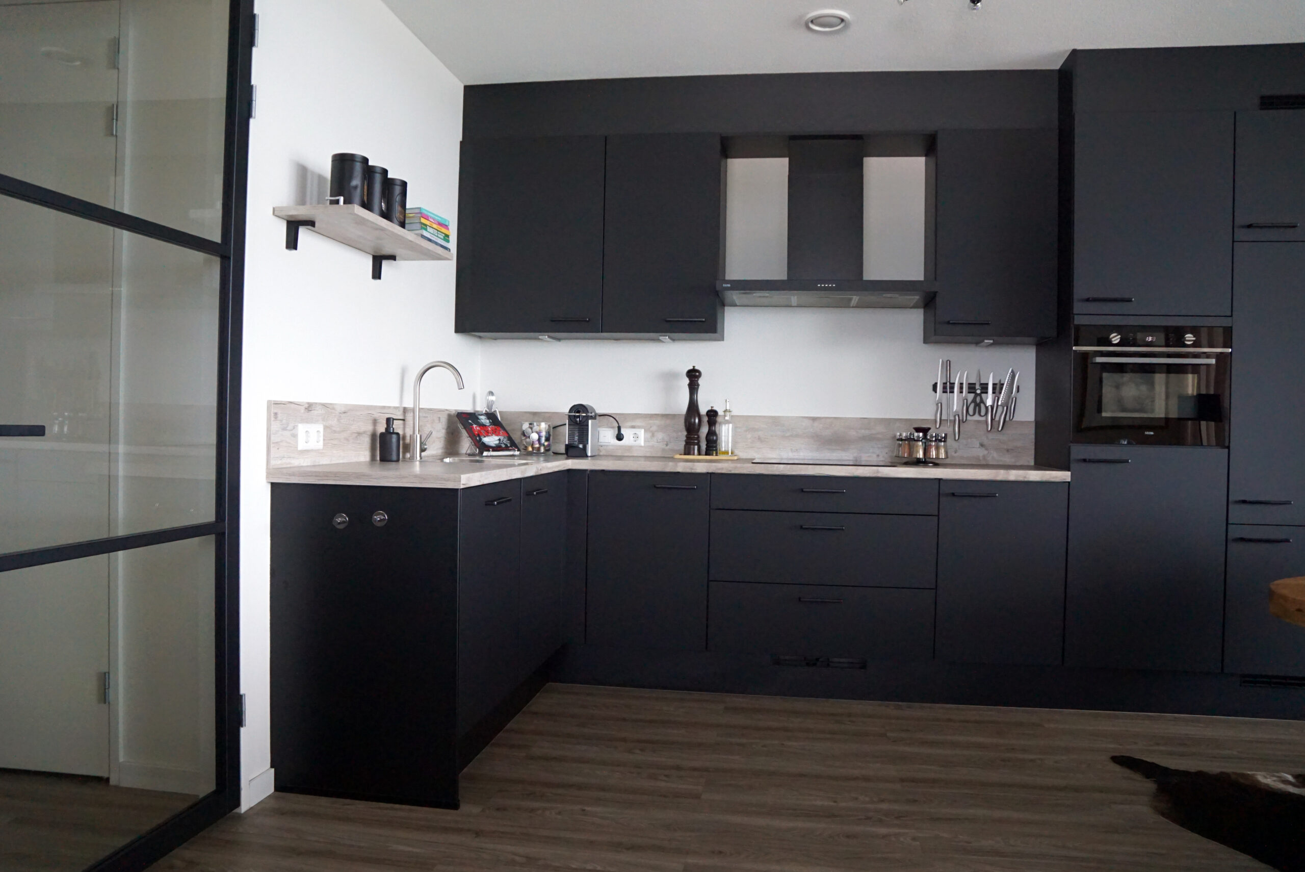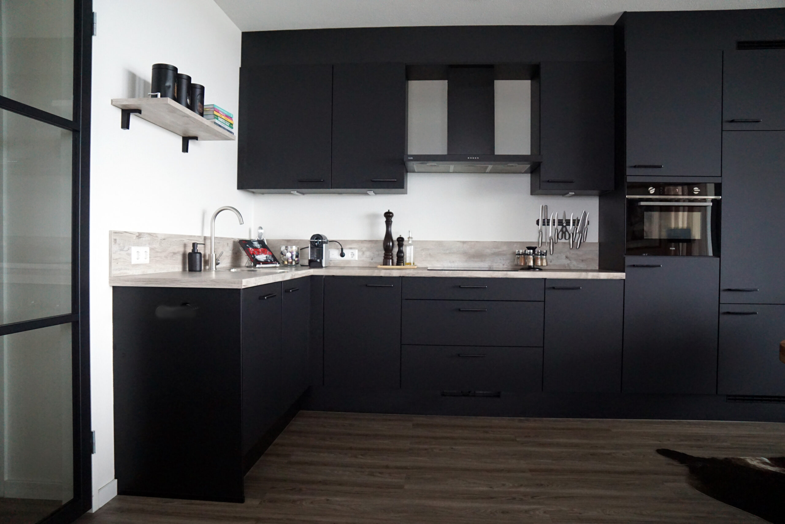 Anderhalf jaar geleden heb ik samen met Jessica gepuzzeld om een zo mooi en praktisch mogelijk open keuken samen te stellen. Zo leek het mij prettig om het naar het plafond toe dicht te maken zodat het als 1 geheel zou overkomen en ik niet steeds met stof boven op de kastjes bezig hoef te zijn. Ik ben enorm blij met het eindresultaat. Ook wilde ik graag een zwarte keuken, maar dan wel dat je niet steeds met vingerafdrukken en vlekken te maken had. Ook dat is super goed gelukt! Er is wel bewust voor het eikenblad gekozen als contrast.