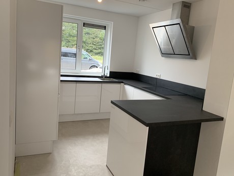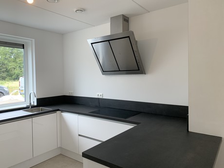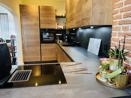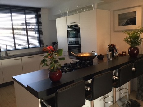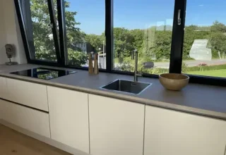 Wat ziet de keuken er prachtig uit! Deze moderne keuken combineert strakke lijnen met natuurlijke elementen voor een frisse en uitnodigende sfeer. Vanuit de keuken heb je prachtig uitzicht op de groene omgeving. Jullie zullen je nooit vervelen tijdens het keuken! Heel veel plezier hiermee!