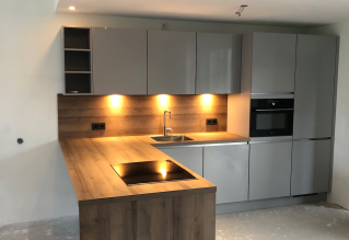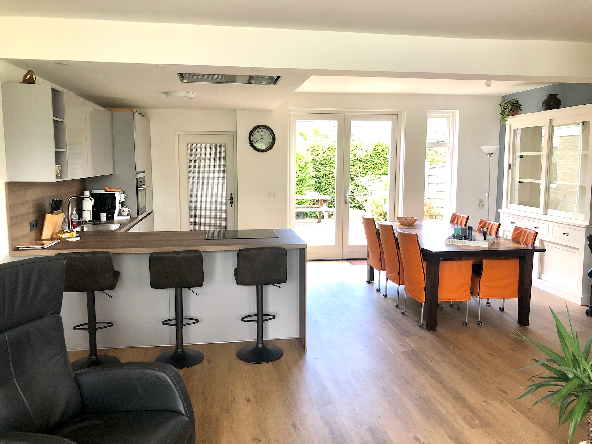 Ik heb een volledig open keuken en totaal geen last van etensluchtjes of hinderlijk geluid in het woon/eet gedeelte. Het ontwerp wat ik eerst voor ogen had heeft hij zodanig aangepast dat er een mooie, rustige lijn in de keuken ontstond.