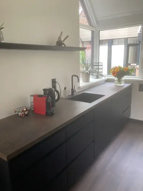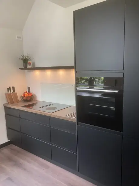 De keuken ziet er prachtig uit! De zwarte kleur in combinatie met het houten keukenblad geeft een luxe, maar ook klassieke uitstraling. Heel veel kookplezier hiermee!