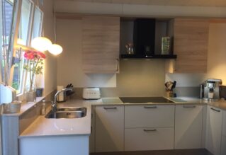 We hebben diverse keukenontwerpen door Wil laten uitvoeren. Uiteindelijk hebben we voor een lichte houtsoort uit gekozen met 2 cm dik gespikkeld composiet. Geen moeite was teveel, druk bestaat er niet. We voelden ons echt op ons gemak en er werd steeds goed geluisterd naar onze (wel vaak) aangepaste wensen. We hebben lang gezocht naar de apparatuur van onze dromen. Uiteindelijk is het NEFF geworden. De stoomoven Slide&Hide , waarvan de deur helemaal onder de oven kunnen schuiven, is super (zie bijgeleverde foto).