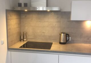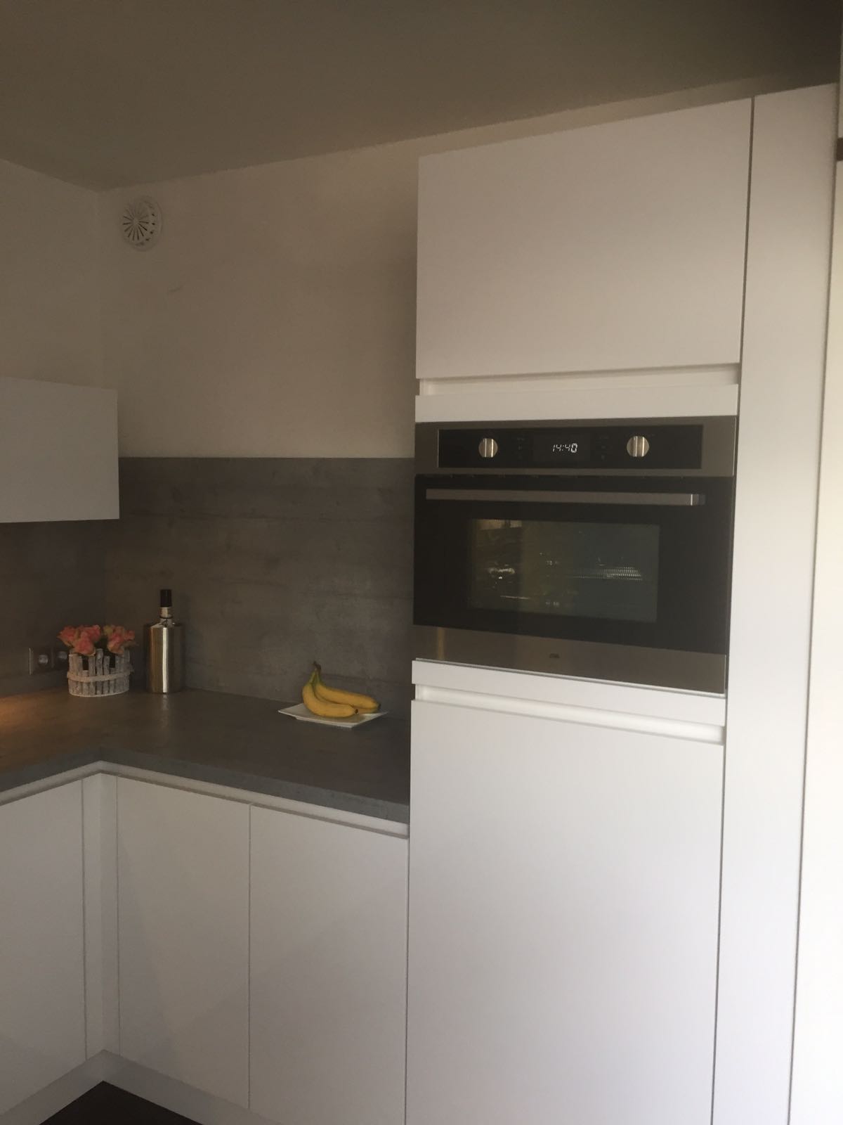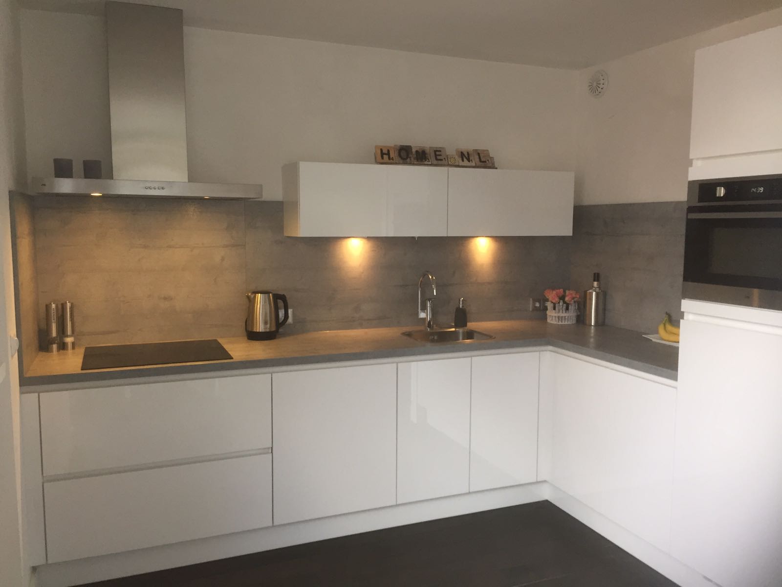 Het is een mooie combinatie geworden de grijze werkbladen met dito achterwanden met de donkere vloer. De monteur hebben heel secuur werk geleverd en hebben in overleg met ons het leidingwerk dat niet goed was voorbereid zodanig aangepast dat de keuken op de juiste manier kon worden geplaatst.