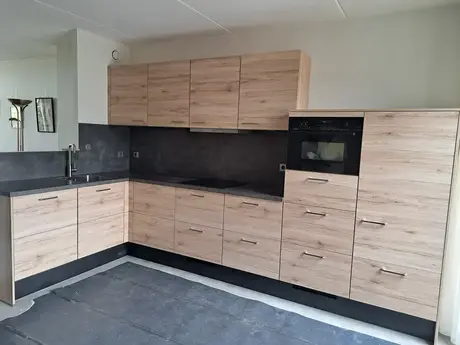 Wat een prachtige keuken! En mooi om te horen hoe jullie het hele proces hebben ervaren. Wij zijn in ieder geval blij dat jullie nu eindelijk kunnen genieten van deze keuken. Deze ruime hoekkeuken combineert een moderne uitstraling met natuurlijke elementen. De houtkleurige kastdeuren geven een warme en uitnodigende sfeer. Echt een plaatje! Veel kookplezier de komende jaren!