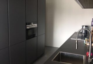 Een strakke keuken welke past in stijl van het appartement. Lang hardstenen werkblad met een super kookplaat .De Afzuiging in de kookplaat is een echte aanrader.