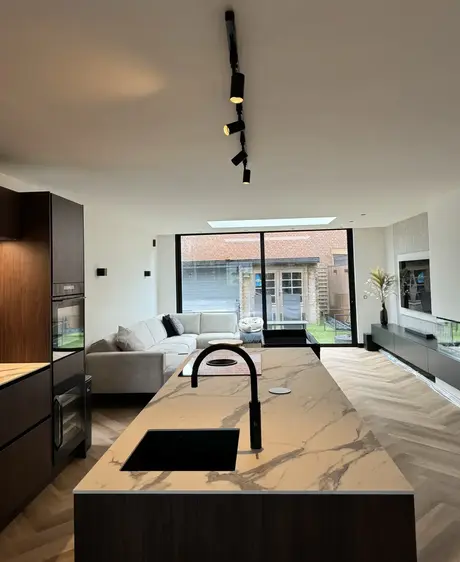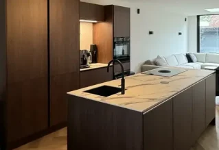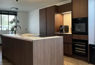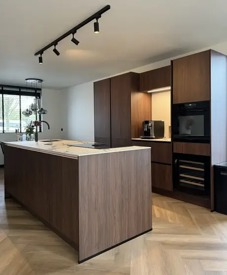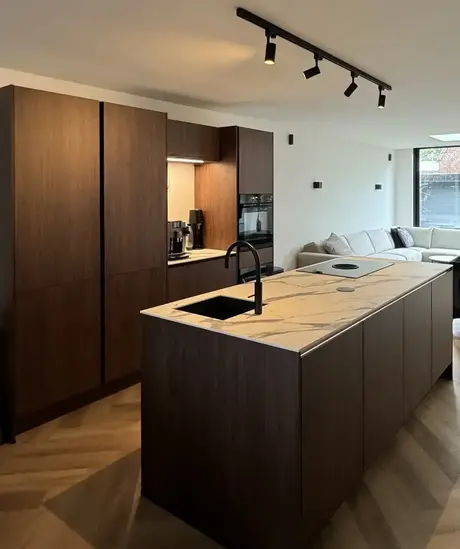 De bruinkleurige keuken ziet er prachtig uit in combinatie met het witte marmerblad keukenblad. Met de eilandkeuken hebben jullie extra veel ruimte om gebruik te maken van alle apparatuur. We zijn blij dat jullie ook tevreden zijn over de service. Veel kookplezier in jullie nieuwe keuken!