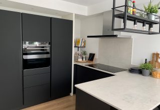 Het resultaat mag er zijn. Een strakke moderne keuken met hightech apparatuur, maar ook een keuken die uitnodigt om gezellig in te blijven “hangen” terwijl er wordt gekookt.