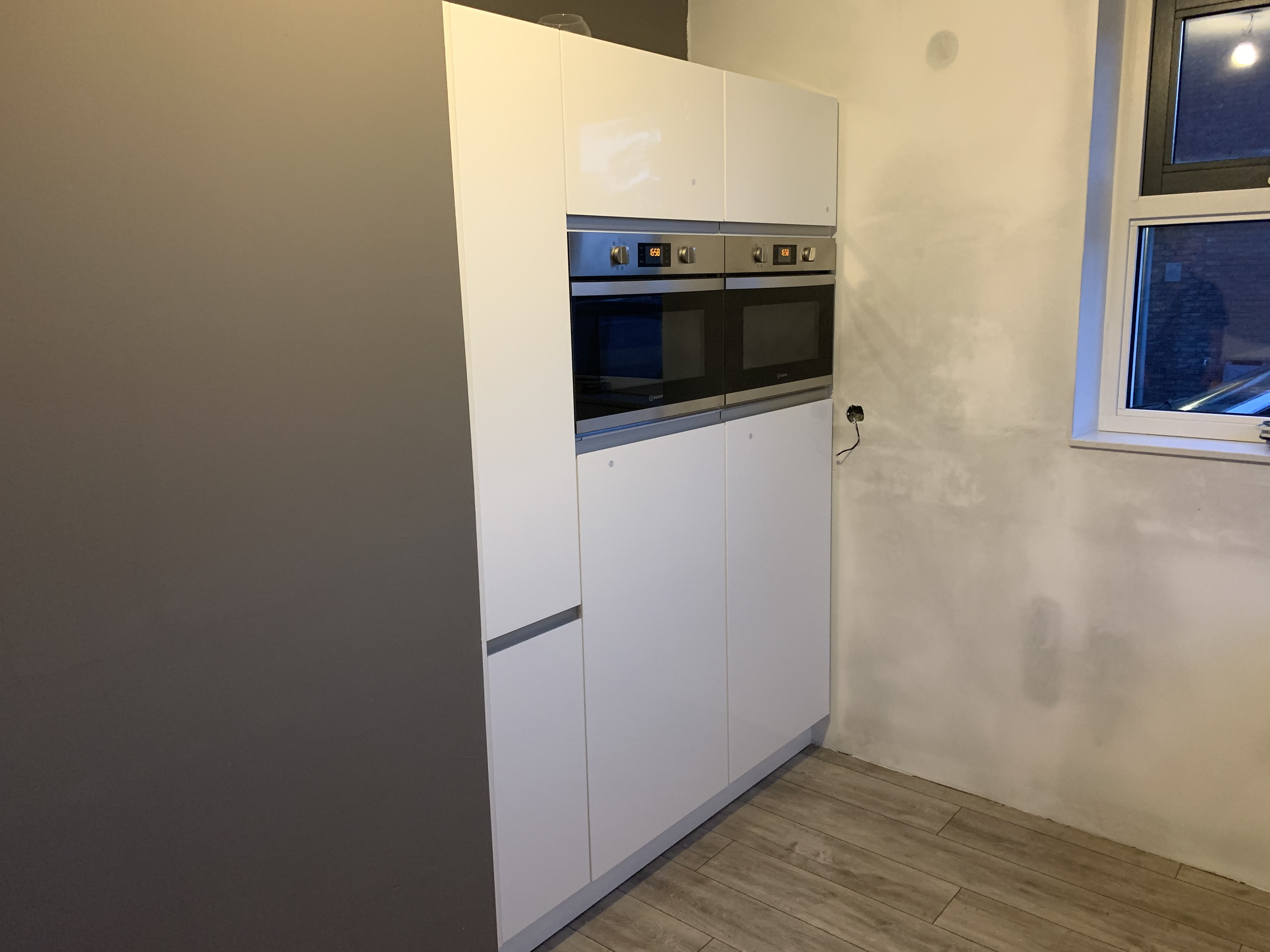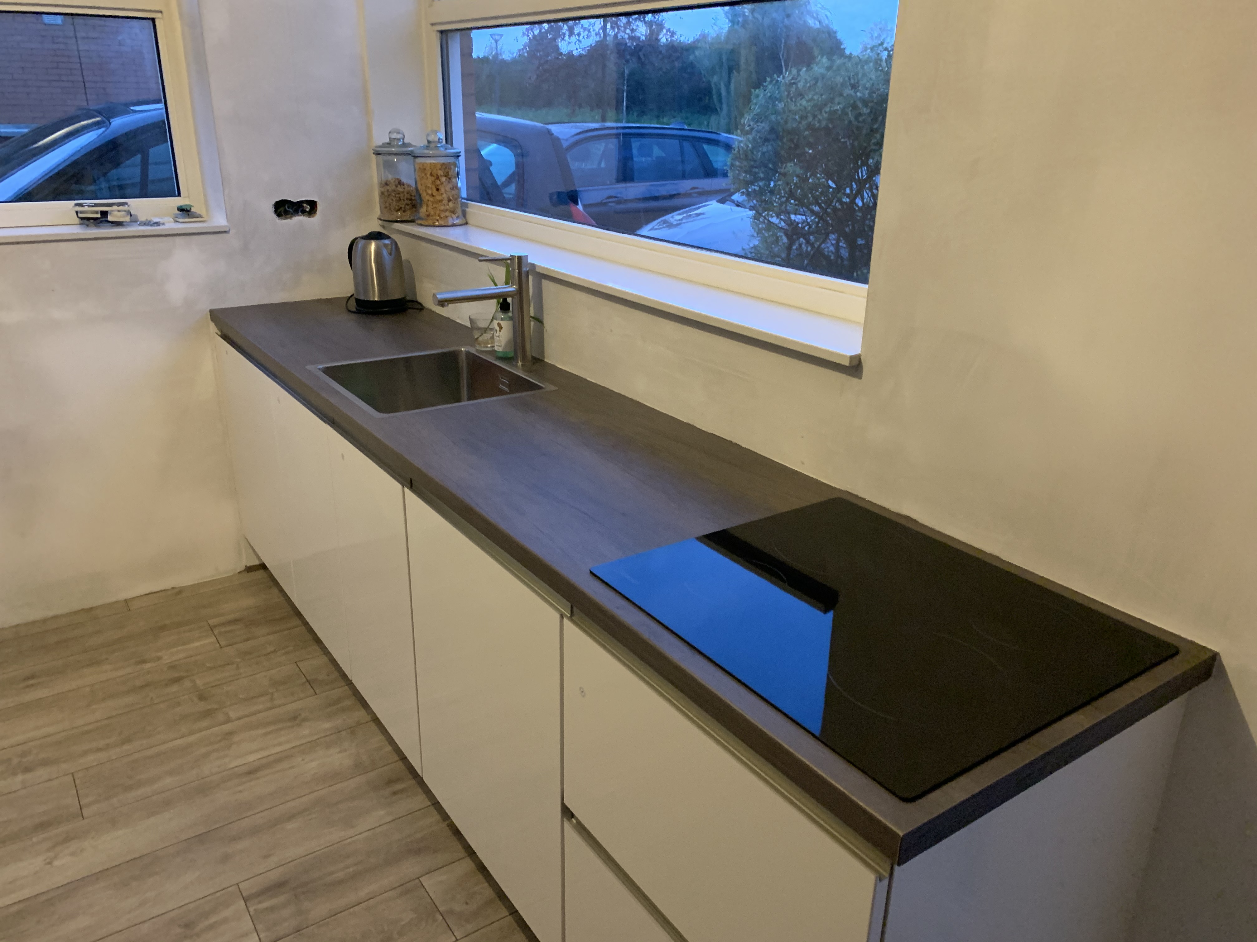 Achteraf had ik toch wat twijfels bij de keuken, ik had de keuken iets langer verwacht. Bij het bezoek van onze keukencoach, bood Henry ons een oplossing aan, een nieuwe kast en een nieuw blad.