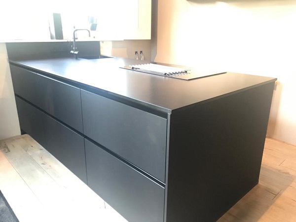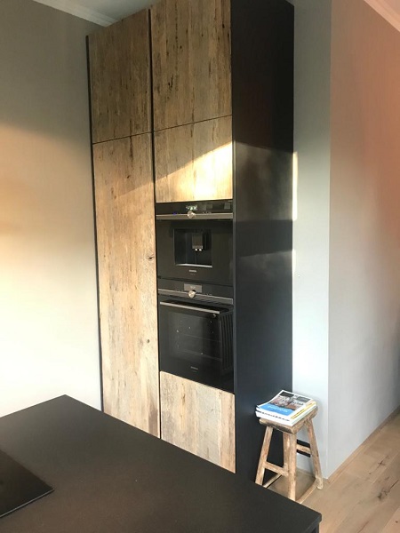 Ons eerste idee om een hele houten keuken uit te kiezen, maar dat zou teveel zijn icm houten vloer. Daarom hebben we gekozen voor een combinatie van zwart met hout.