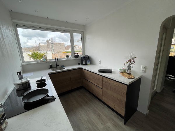 Uiteindelijk hebben we gekozen voor een greeploze U keuken, met houten frontjes en een strak marmeren werkblad. We hebben optimaal gebruik gemaakt van de ruimte, door de efficiënte opstelling, waardoor we een groot oppervlak aan werkruimte hebben. Daarnaast is deze keuken voorzien van veel opbergruimte.