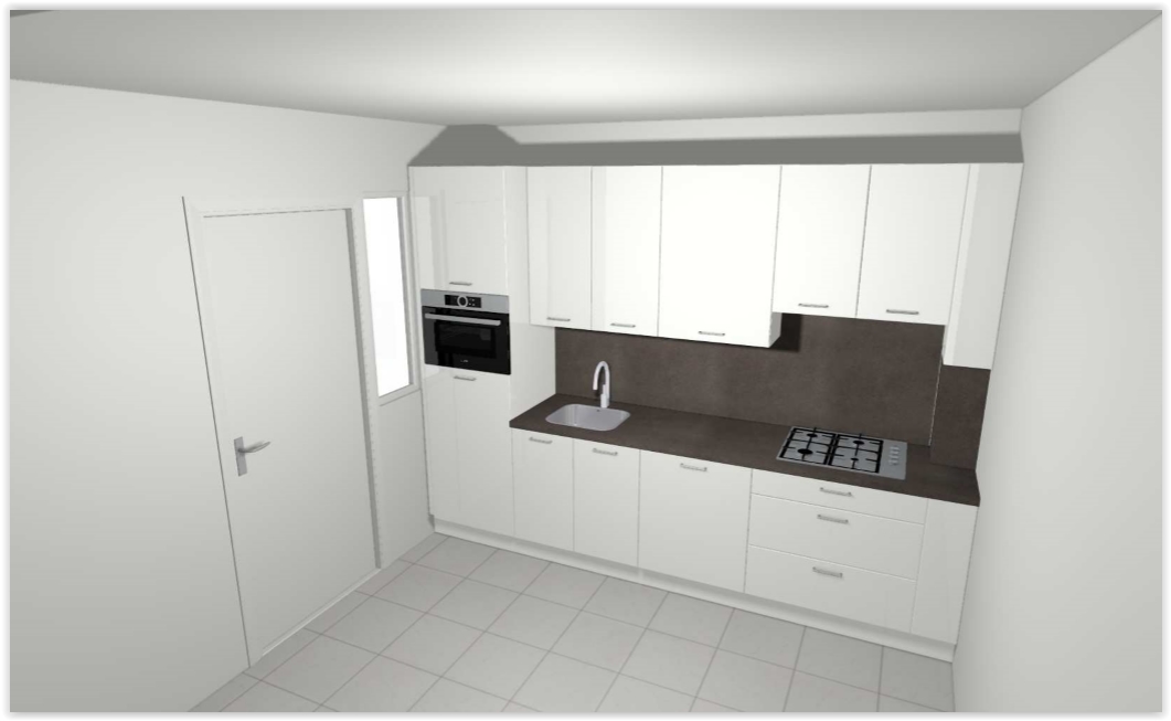 De afvoerleiding in de hoek is prachtig weggewerkt. Ook de extra aanpassing in de kast waar de afzuigkap zich bevindt is prachtig opgelost.