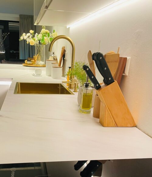 Beste familie Zubair, dank voor het delen van jullie ervaring. Met de mooie gouden accenten en marmerlook werkblad zaten jullie aan de juiste tafel! Samen hebben wij er iets moois van gemaakt. Heel veel kookplezier en geniet van jullie mooie keuken!