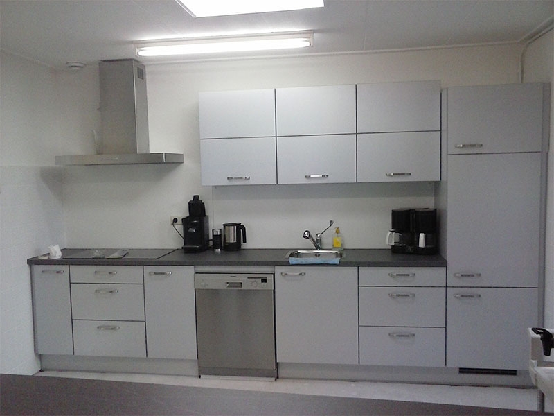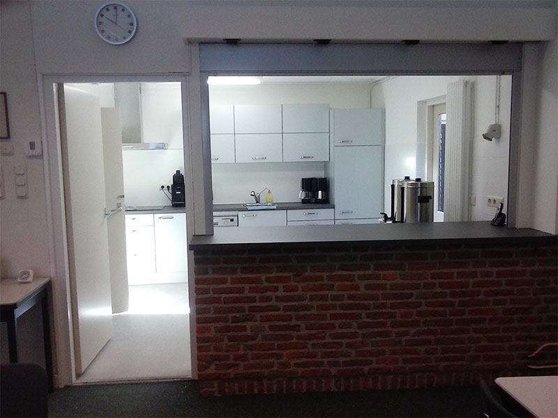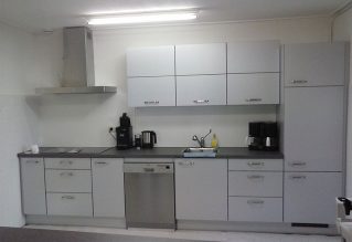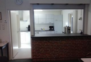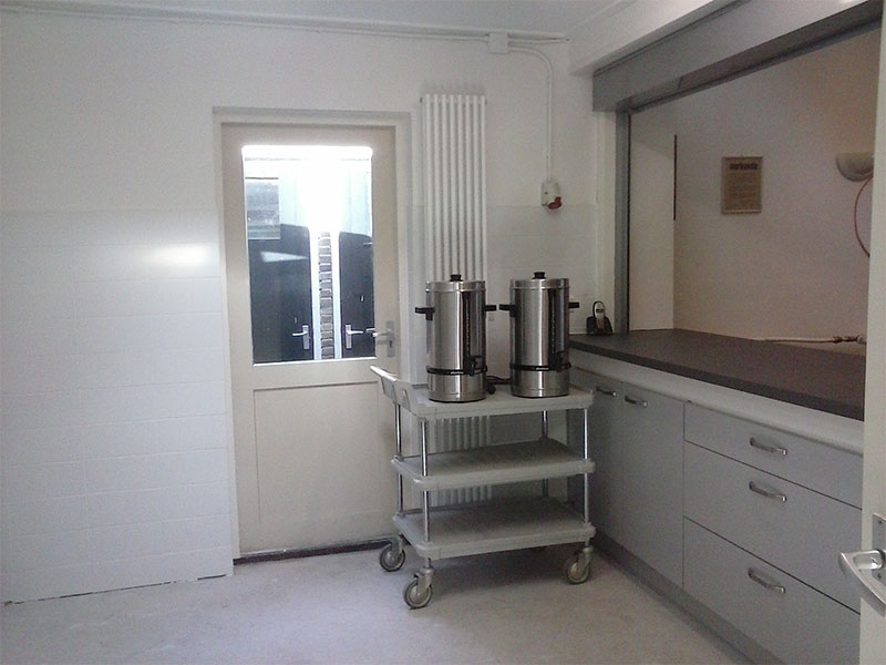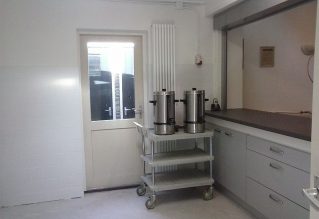 Het betreft een kleine keuken voor een kosterij maar het was mogelijk hier een maaltijd met ZEVEN gangen voor 55 studenten te realiseren! De ingehuurde kok heeft ons daarom gecomplimenteerd met deze keuken.