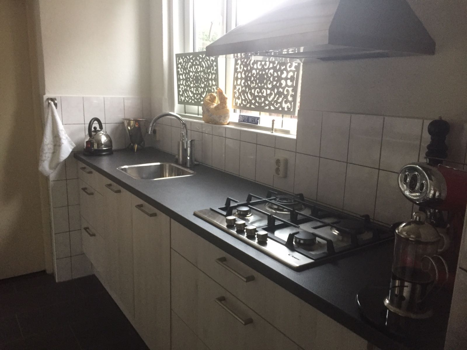 Dean de monteur is een echte Engel. Hij heeft mijn bestaande keukenkastjes op eigen initiatief ingekort en weer opgehangen zodat de doorloopruimte nu optimaal is.