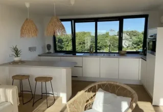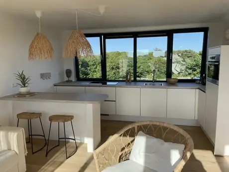 Wat ziet de keuken er prachtig uit! Deze moderne keuken combineert strakke lijnen met natuurlijke elementen voor een frisse en uitnodigende sfeer. Vanuit de keuken heb je prachtig uitzicht op de groene omgeving. Jullie zullen je nooit vervelen tijdens het keuken! Heel veel plezier hiermee!